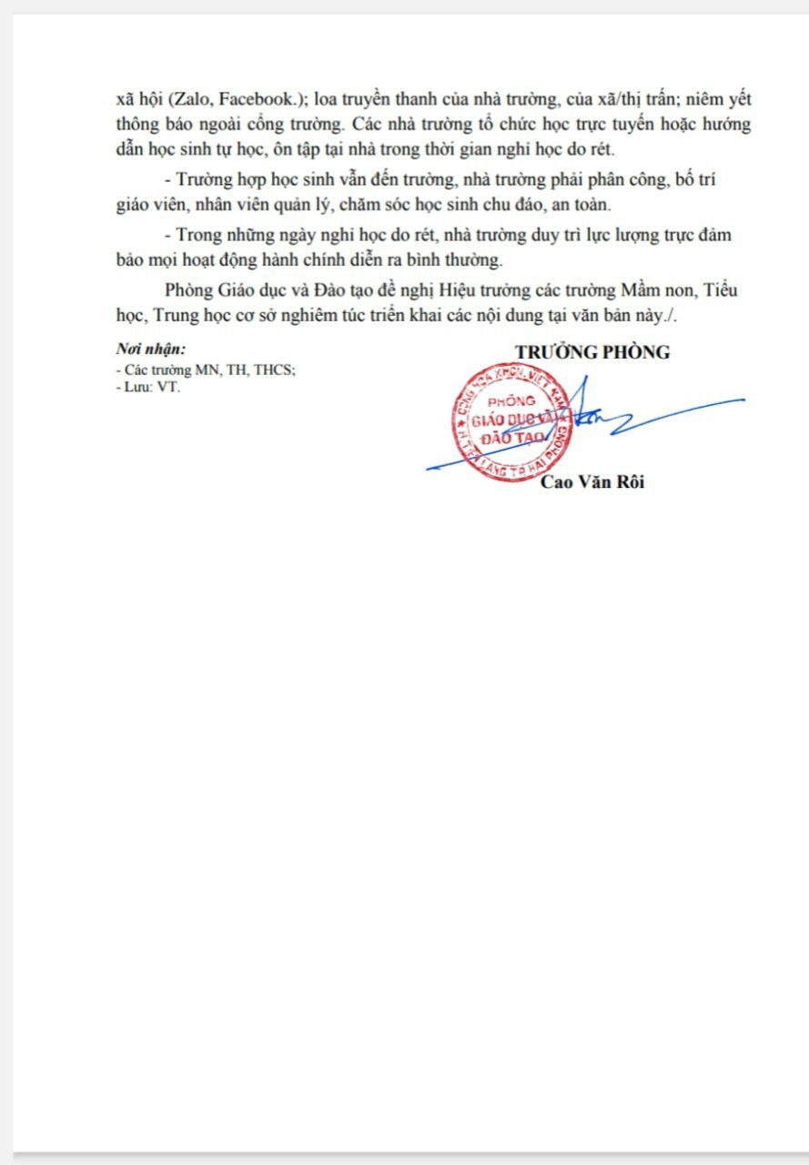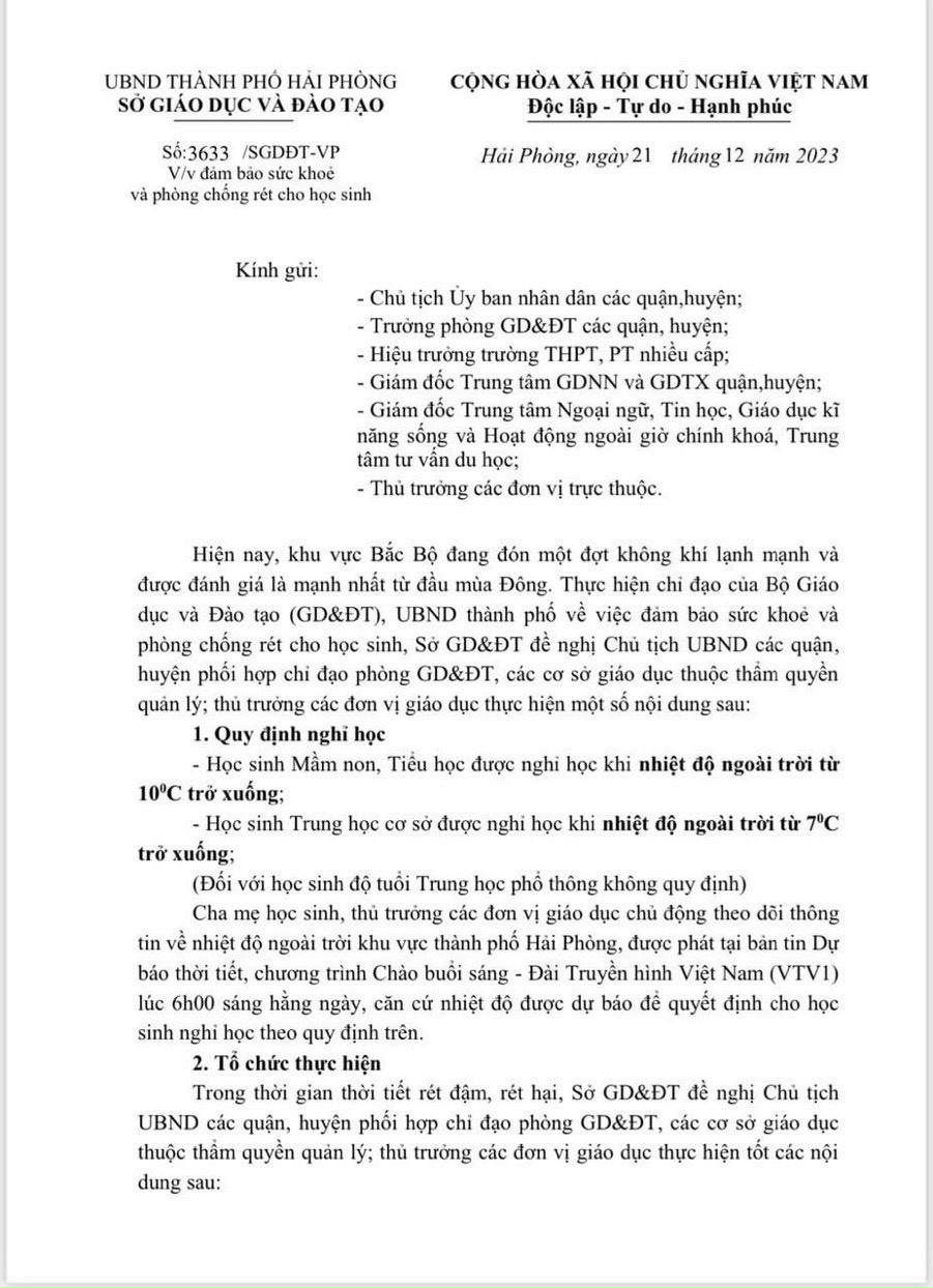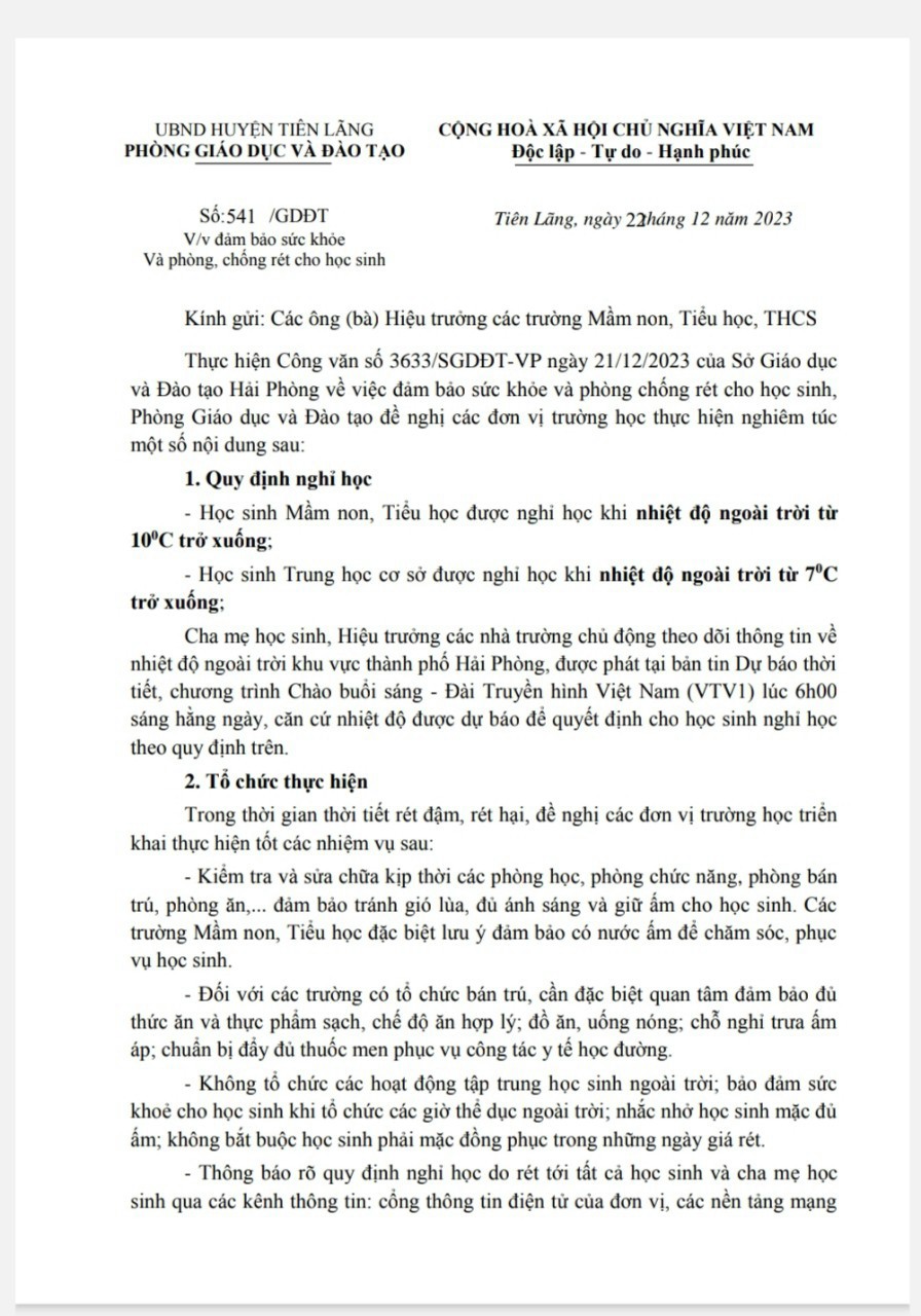 Căn cứ thời tiết,nhiệt độ được dự báo để cho học sinh nghỉ học theo văn bản chỉ đạo của Sở GDĐT: số 3633/SGDĐT-VP ngày 21/12/2023 và Công văn số 541/GDĐT ngày 22/12/2023 của Phòng GD&ĐT huyện.Trân trọng cảm ơn!