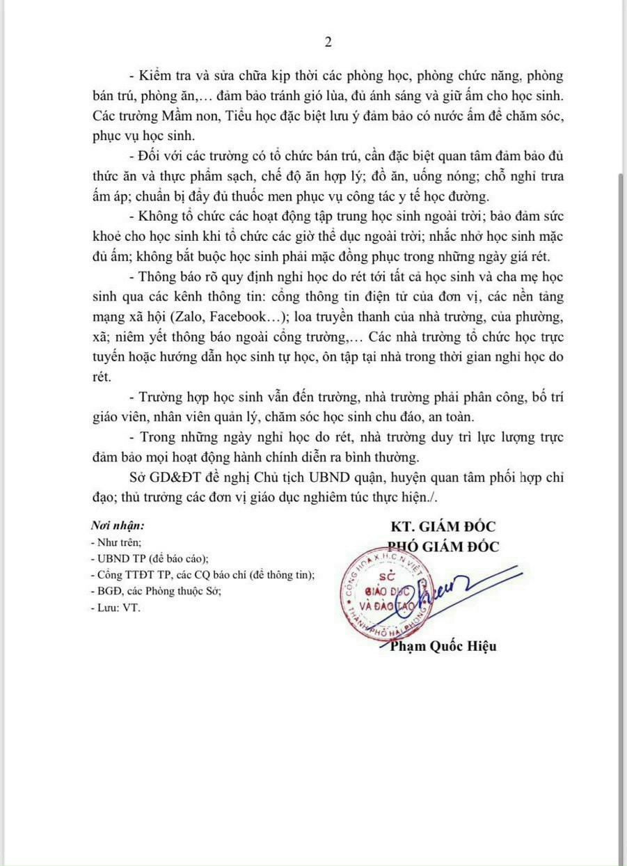 Để đảm bảo sức khỏe và phòng chống rét cho học sinh trong những ngày rét đậm. Nhà trường đề nghị các bậc phụ huynh học sinh, các đồng chí giáo viên, nhân viên chủ động phối hợp cùng Ban giám hiệu theo dõi thông tin về thời tiết, nhiệt độ ngoài trời khu vực thành phố Hải Phòng, được phát tại bản tin Dự báo thời tiết, chương trình Chào buổi sáng - Đài Truyền hình Việt Nam (VTV1) lúc 6h00 sáng hằng ngày.