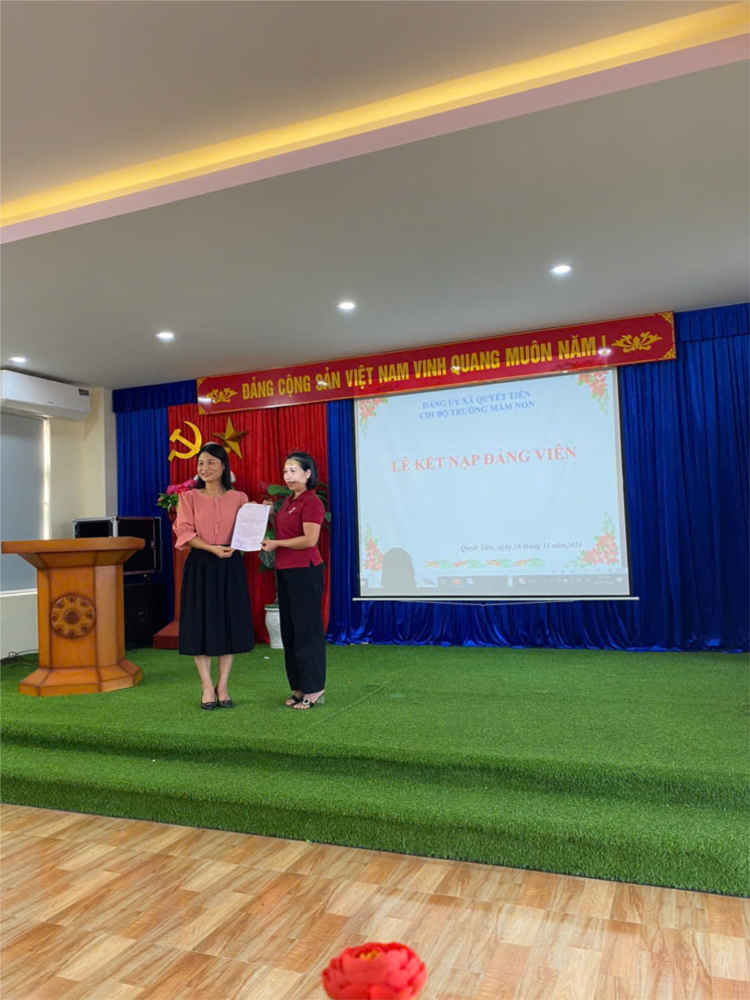 Thực hiện Nghị quyết Đại hội Chi bộ của trường về việc phát triển Đảng viên. Ngày 18/11/2024, Chi bộ trường Trường Mầm non Quyết Tiến đã long trọng tổ chức lễ kết nạp Đảng viên mới đối với 1 quần chúng ưu tú: Vũ Thị Giang. Đây là sự kiện có ý nghĩa quan trọng trong công tác xây dựng Đảng, góp phần phát triển, nâng cao chất lượng và sức chiến đấu của Chi bộ trường nói chung và các cá nhân Đảng viên nói riêng.