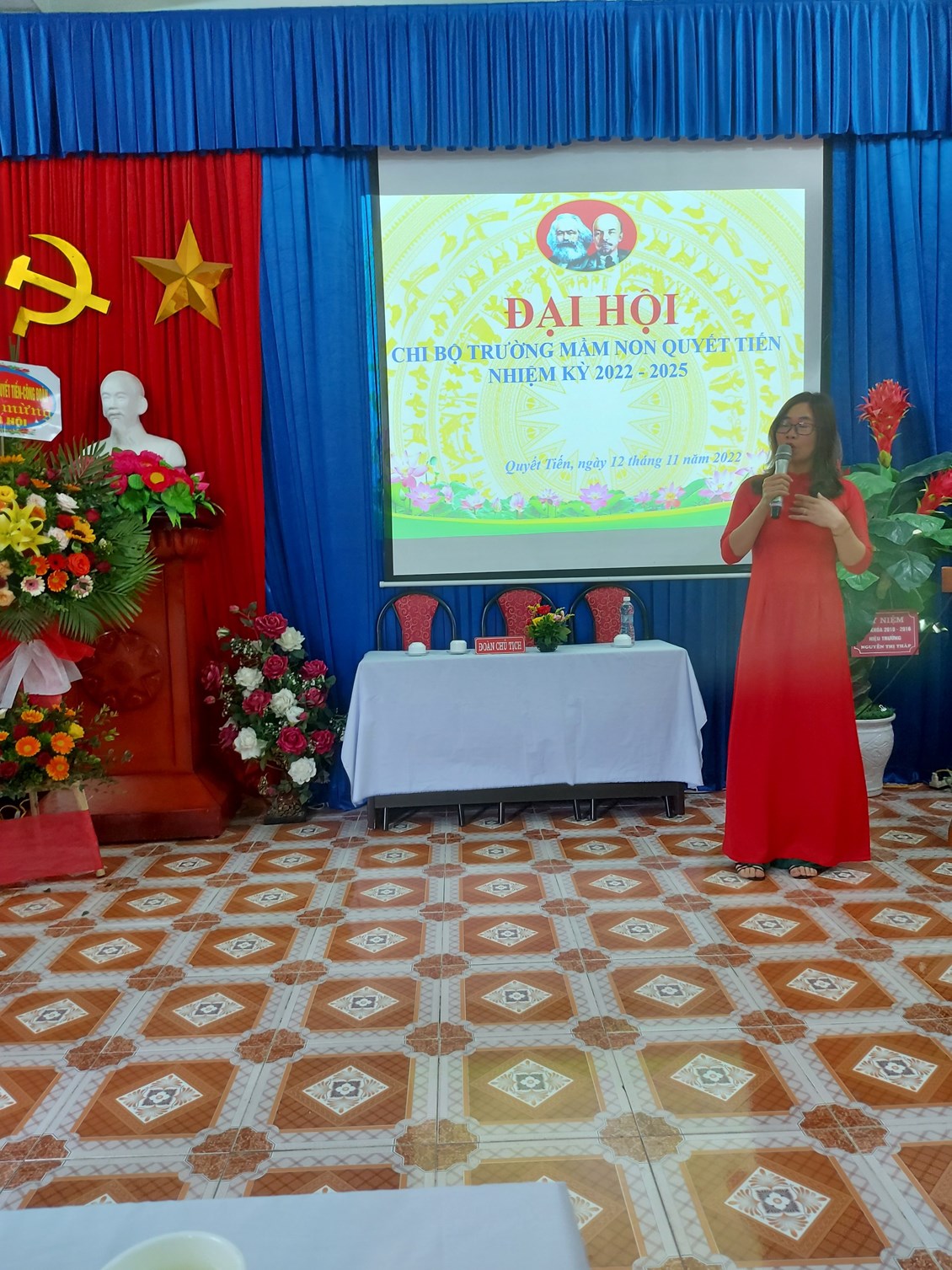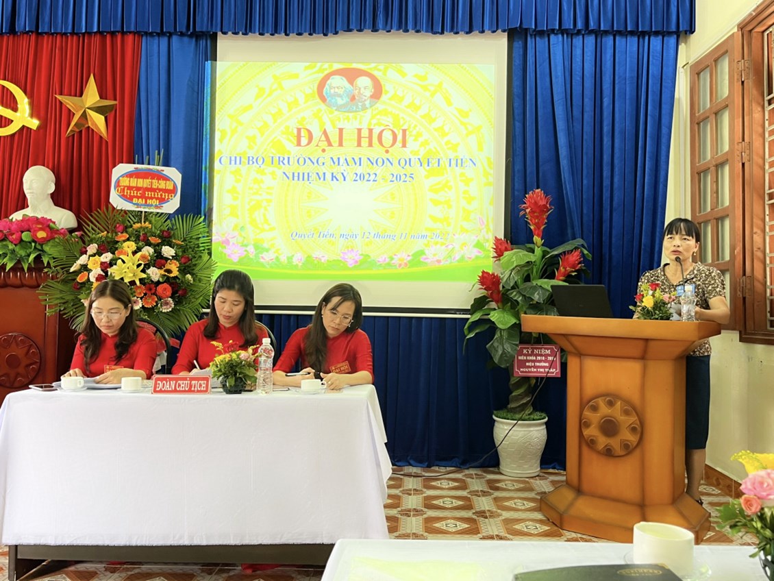 Phát biểu chỉ đạo đại hội, đồng chí Phạm Thị Chung- Bí thư Đảng ủy xã Quyết Tiến đã ghi nhận, đánh giá cao sự nỗ lực, cố gắng của tập thể Chi bộ Trường Mầm non Quyết Tiến đã thực hiện thắng lợi các mục tiêu mà Nghị quyết đại hội nhiệm kỳ 2020-2022 đã đề ra. Đồng thời biểu dương sự đoàn kết, nhất trí cao trong tập thể chi bộ của nhà trường đặc biệt là lãnh đạo thực hiện nhiệm vụ của Chi ủy trong nhiệm kỳ qua. Đồng chí đề nghị cán bộ, Đảng viên của Chi bộ Nhà trường phát huy tinh thần trách nhiệm thực hiện tốt nghị quyết Đại hội chi bộ nhiệm kỳ 2022-2025; Tập trung chỉ đạo thực hiện tốt nhiệm vụ năm học.