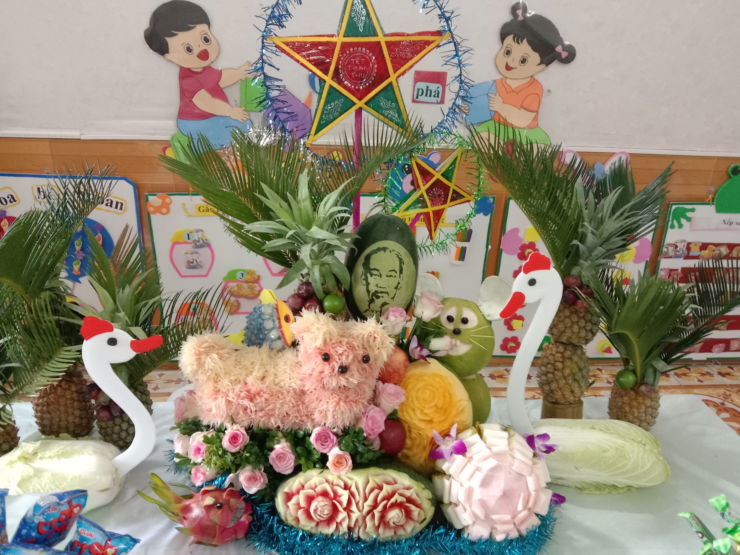 Tết trung thu là dịp để mọi người trong gia đình xum họp, là dịp các em nhỏ vui chơi rước đèn phá cỗ đón trăng. Hằng năm cứ vào dịp trung thu cô và trò trường mầm non quyết Tiến laị háo hức làm mâm cỗ rồi tổ chức chương trình vui hội trăng rằm cho bé. Trung thu nam nay cũng vậy cô và bé lớp cơm thường 1 lại háo hức, tuy rằng các bé trong độ tuổi rất nhỏ mới đi học còn khấy khóc, nhưng nhìn các con rất cố gắng, phấn khởi mong chờ ngày tết trung thu dược phá cỗ , được xem múa sư tử, được gặp chị Hằng – chú cuội và được xem các tiết mục văn nghệ của các anh chị. Với 23 năm trong nghề và hình ảnh chú cuội đã gắn liền với cô giáo Vũ Hồng Chuyên suốt những năm qua.