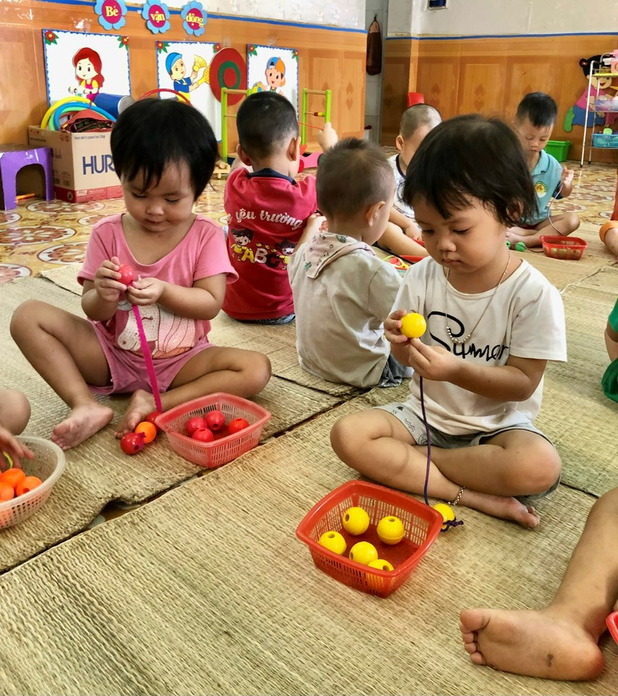 Cô hướng dẫn bé cách xâu vòng