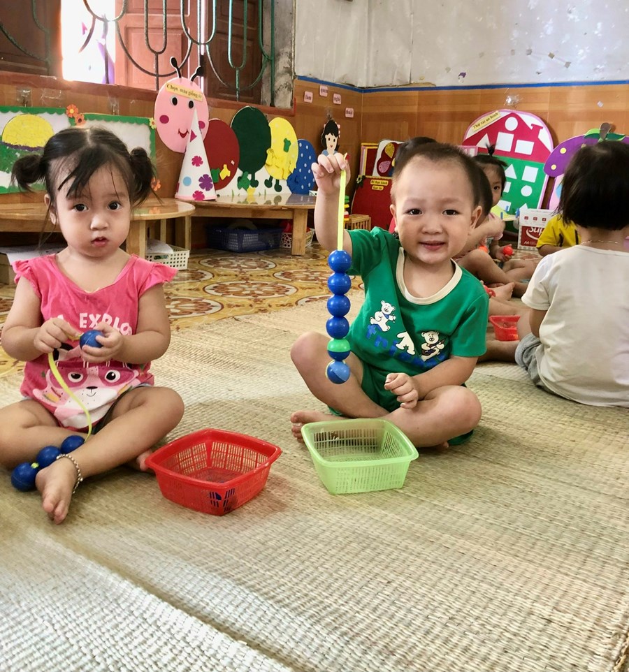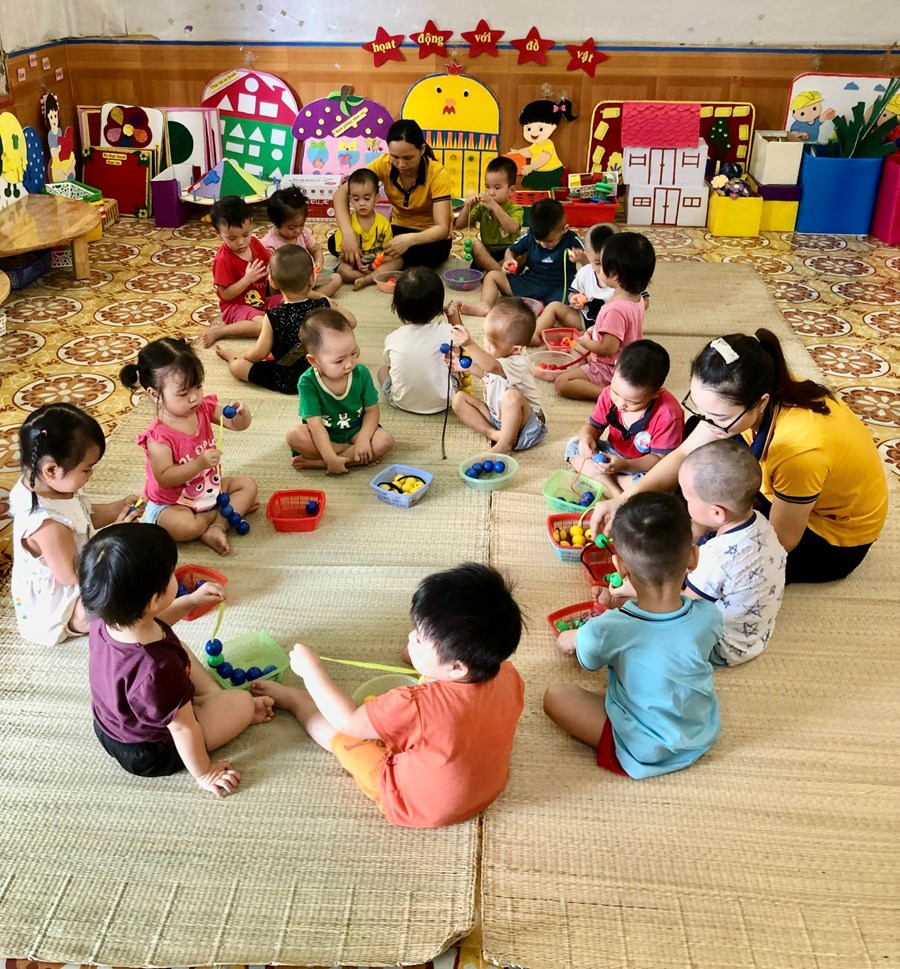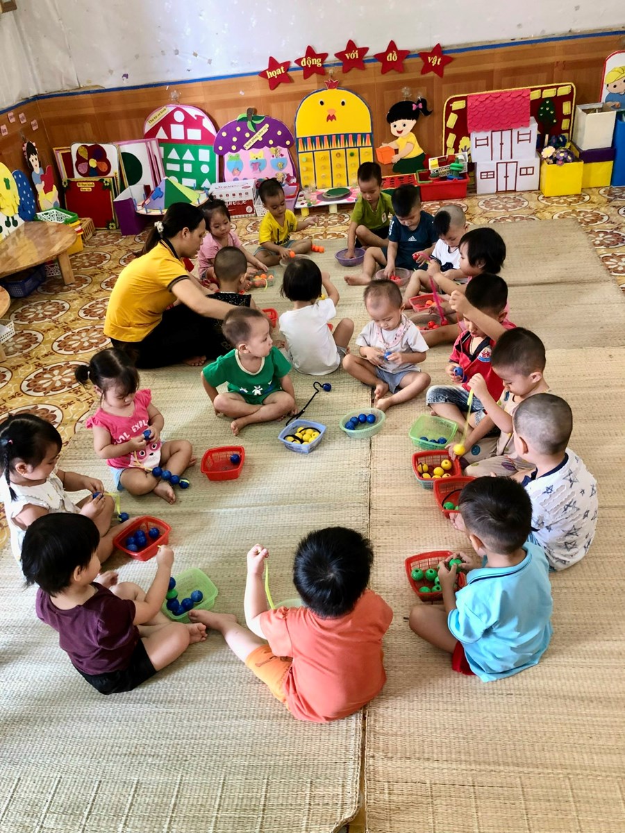 Một số hình ảnh của cô giáo và các bạn nhỏ lớp nhà trẻ Cơm thường 2 trường MN Quyết Tiến với giờ học PTNT hoạt động với đồ vật: Bé xâu chiếc vòng màu xanh - đỏ- vàng.