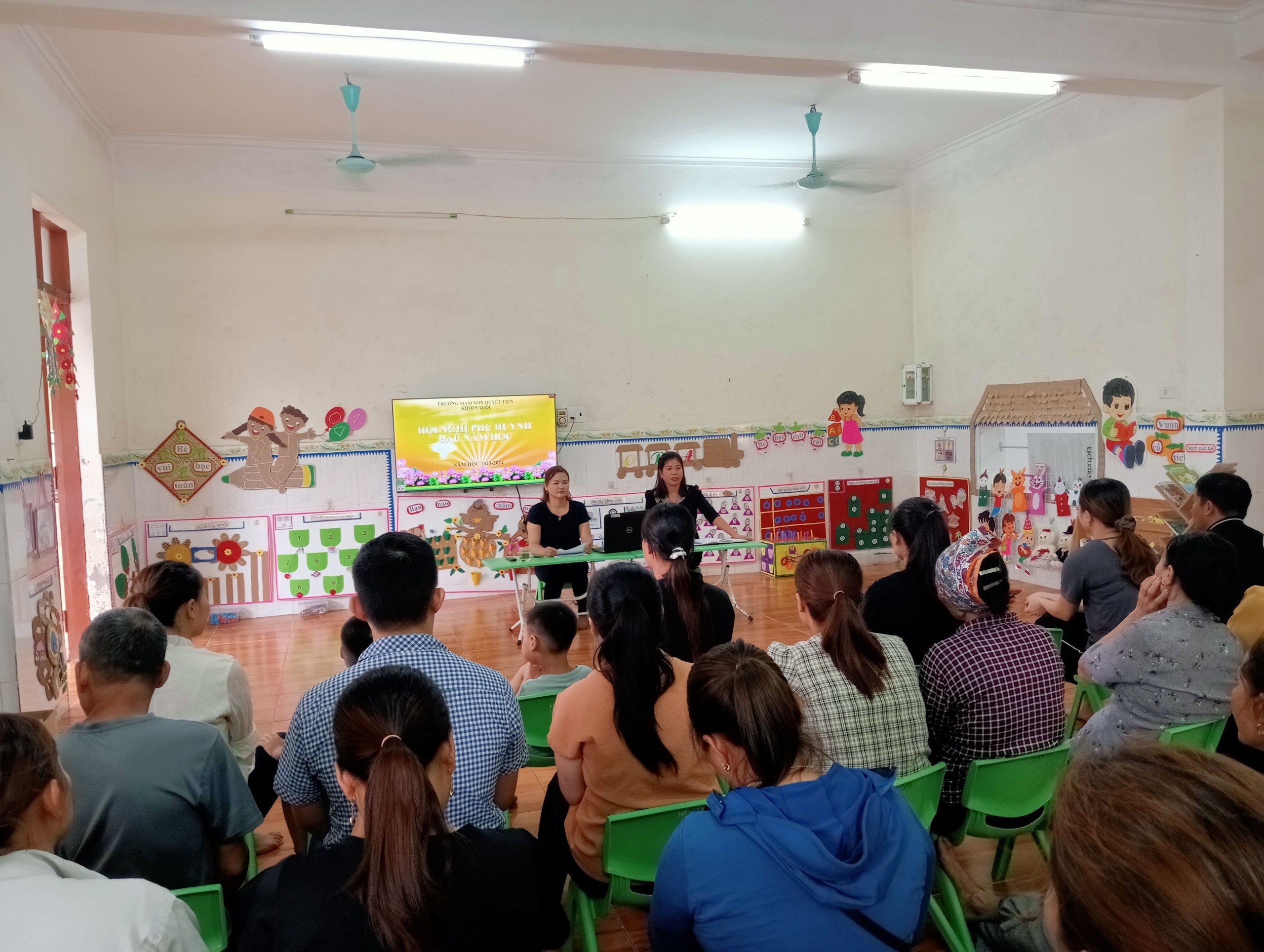 Trong buổi họp phụ huynh đầu năm học giáo viên tuyên truyền kiến thức tới các bậc phụ huynh về hoạt động chăm sóc giáo trẻ.