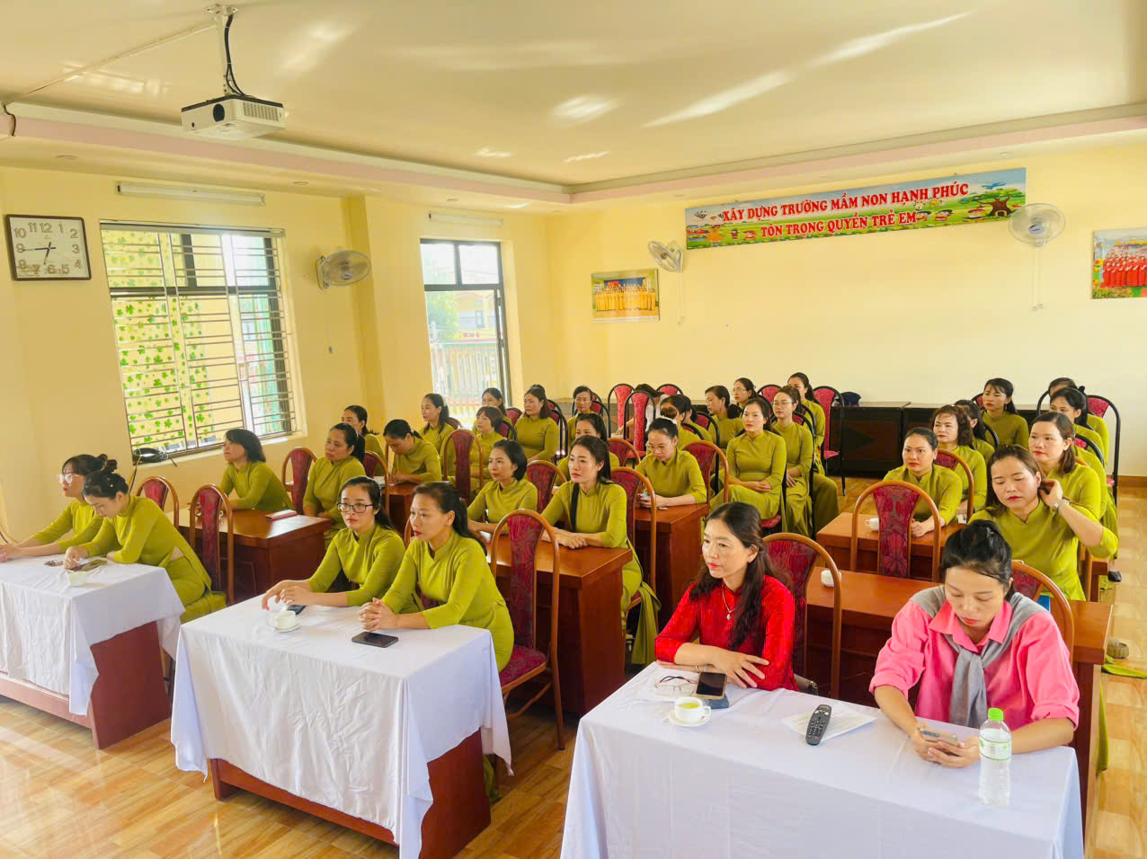 Thực hiện công văn số 7074/HD-SGDĐT ngày 25/9/2025 của Sở GD&ĐT Hải Phòng về việc hướng dẫn tổ chức Hội nghị cán bộ, viên chức, người lao động các cơ sở giáo dục trực thuộc năm học 2025-2026. Sáng ngày 16 tháng 10 năm 2025 Trường Mầm non Quyết Tiến đã tổ chức Hội nghị cán bộ, viên chức, người lao động trong không khí trang trọng, dân chủ và đầy tinh thần trách nhiệm. Hội nghị nhằm đánh giá, tổng kết những kết quả đã đạt được trong năm học 2024 – 2025; đồng thời thảo luận, thống nhất xây dựng phương hướng, chỉ tiêu và các giải pháp thực hiện nhiệm vụ năm học 2025-2026. Tham dự Hội nghị có Ban Giám hiệu, toàn thể cán bộ, giáo viên, nhân viên nhà trường cùng đại diện Ban Thanh tra nhân dân.