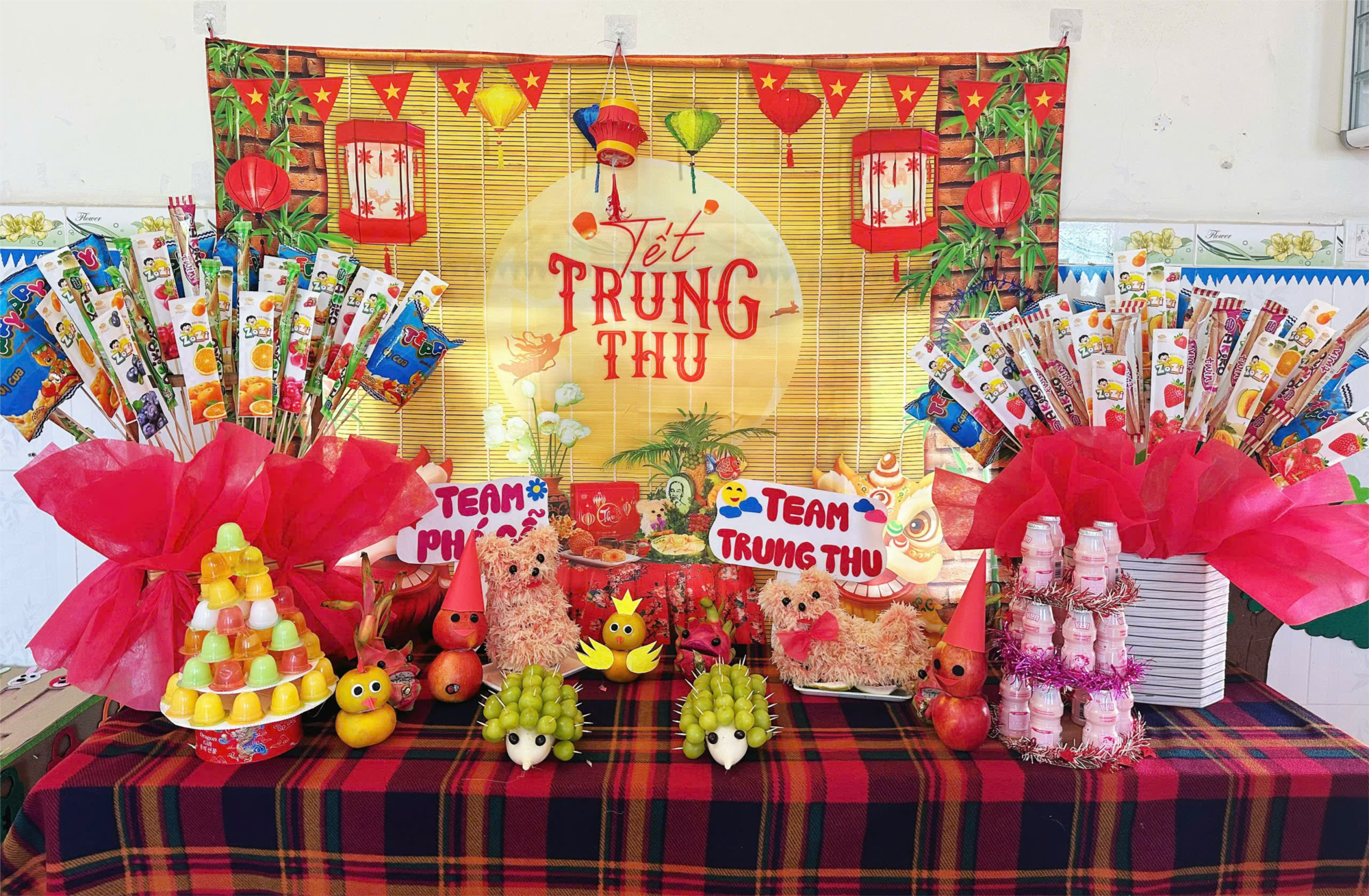Trong ngày hội, các bé được xem múa lân, rước đèn ông sao, cùng chị Hằng – chú Cuội vui chơi, hát múa và tham gia nhiều trò chơi dân gian thú vị. Đặc biệt, những mâm cỗ Trung thu rực rỡ sắc màu do các cô giáo và phụ huynh cùng chung tay chuẩn bị đã mang đến cho ngày hội thêm phần ấm áp, ý nghĩa.